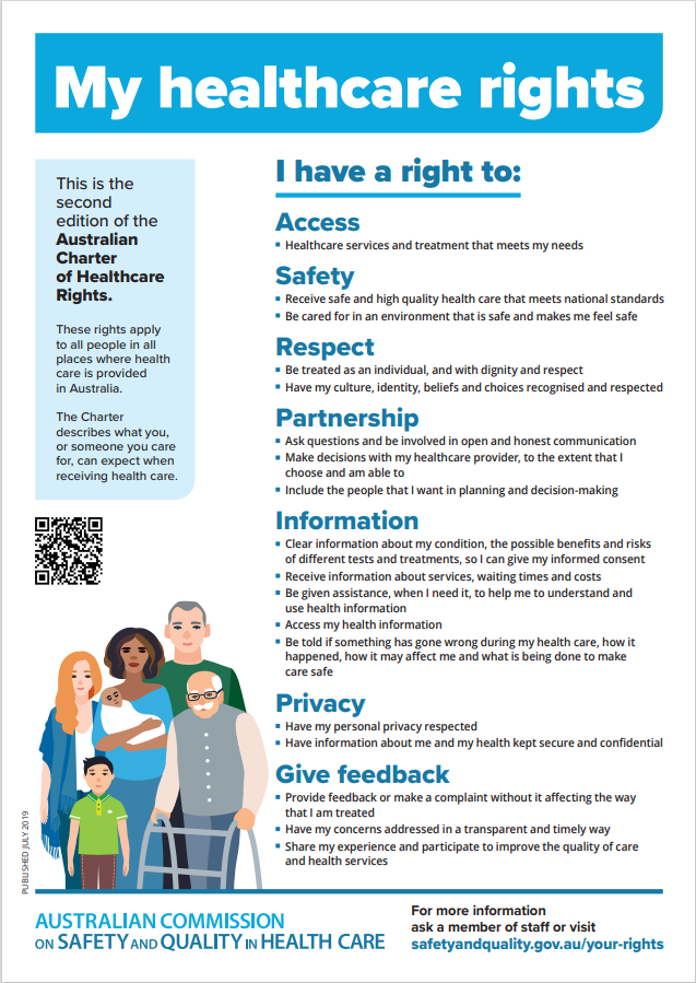 The Australian Charter of Healthcare Rights describes what consumers, or someone they care for, can expect when receiving health care.