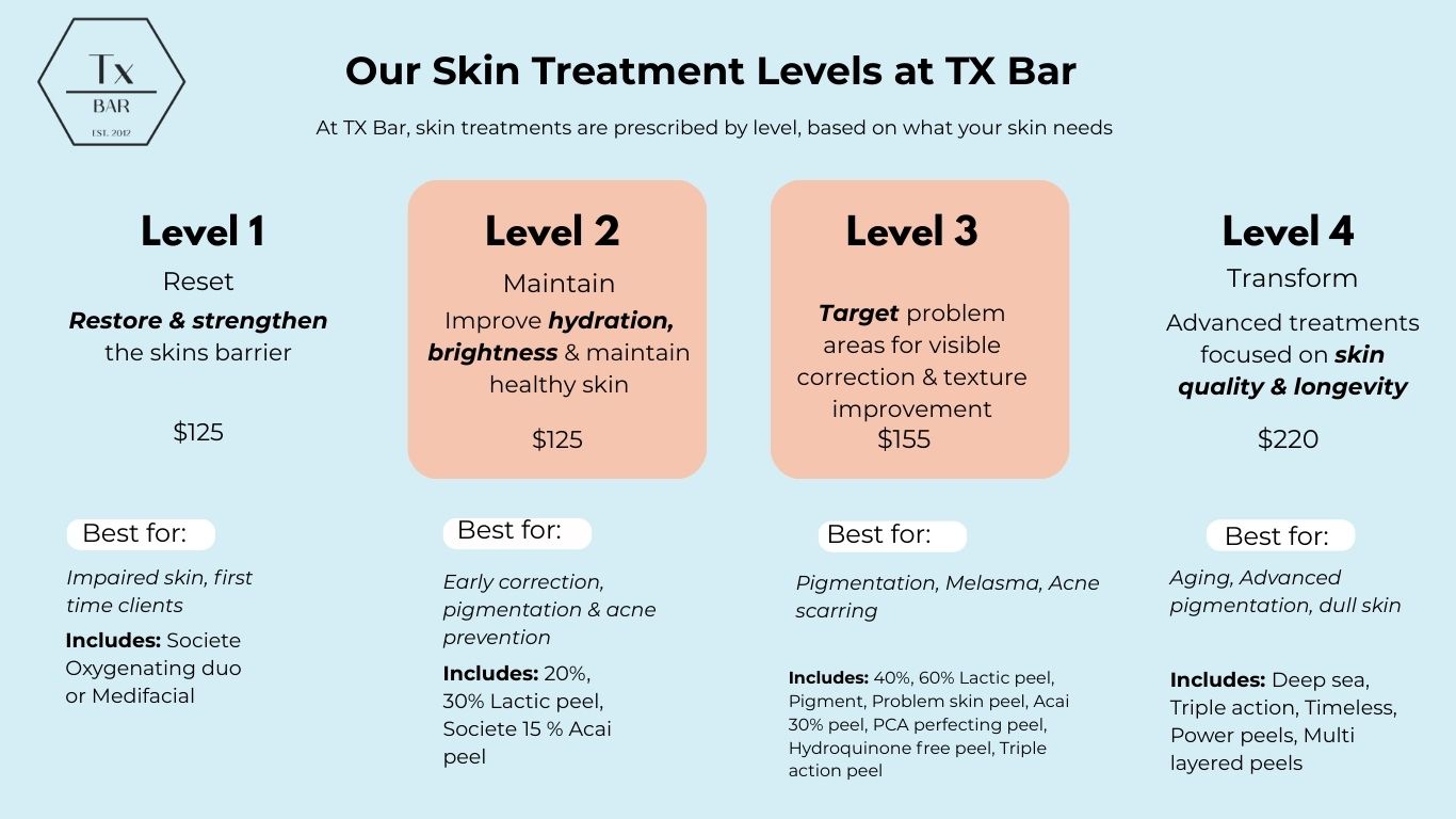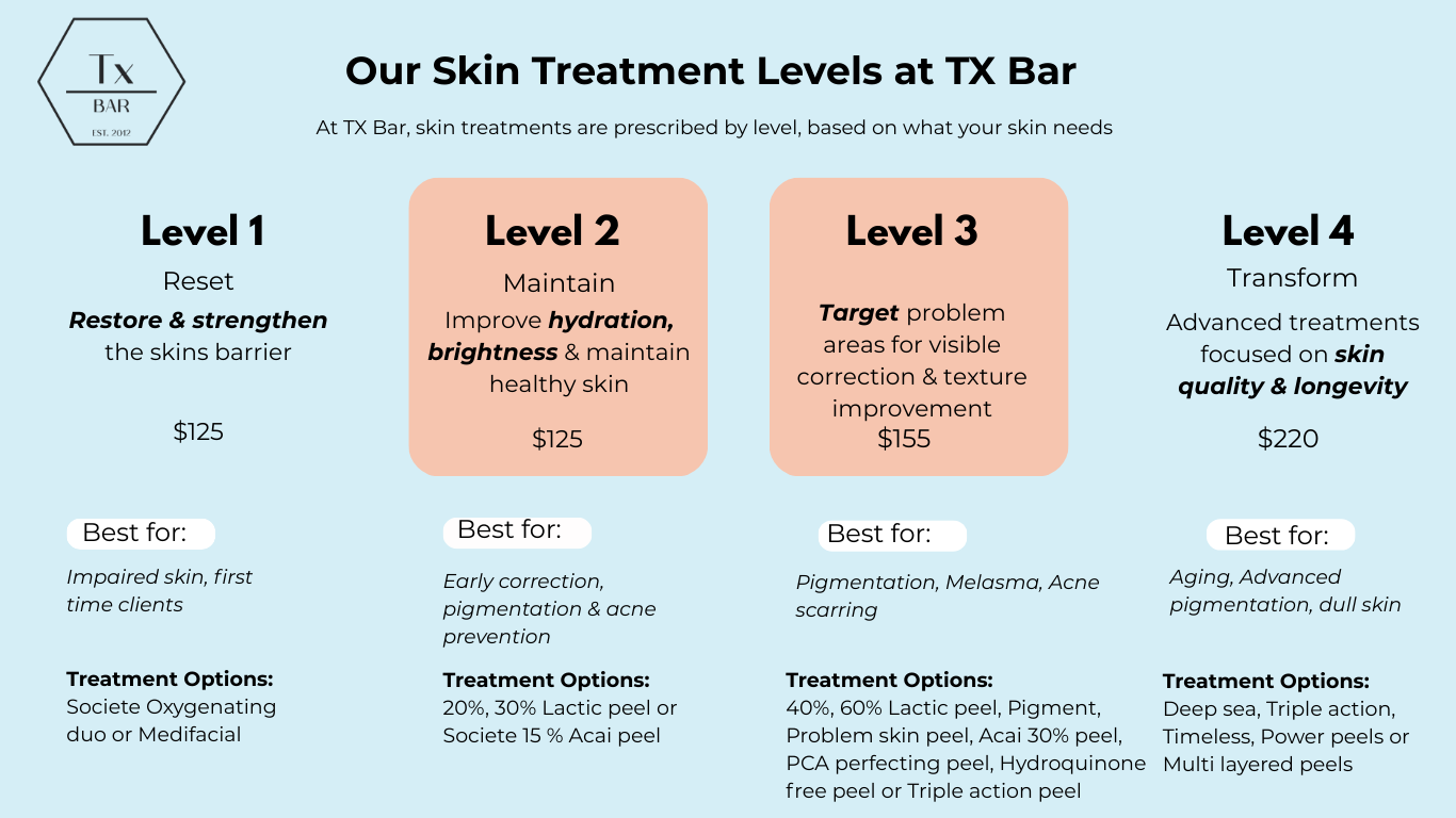 After a series of acne treatments at Tx Bar you will notice clearer, smoother skin with reduced congestion and fewer breakouts, preparing skin for further corrective treatments if needed.