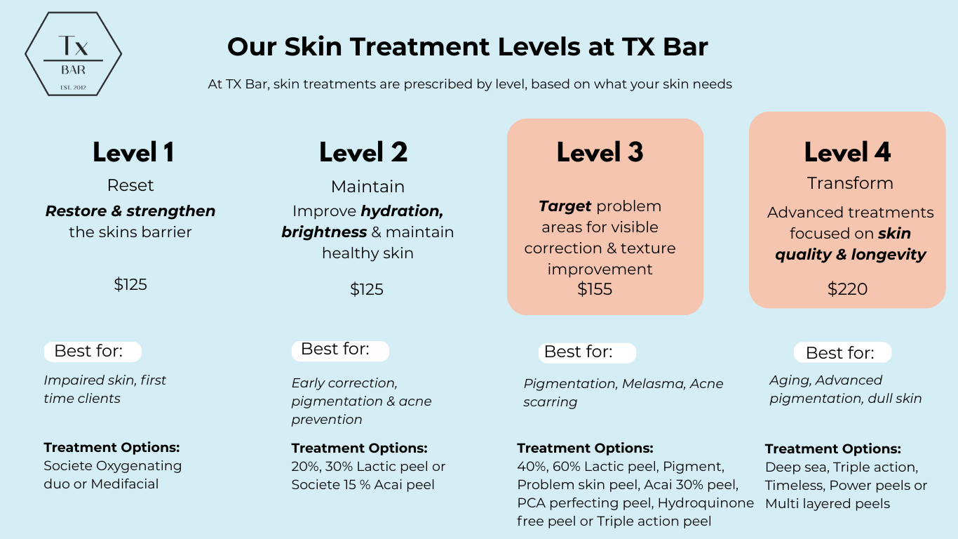 At TX Bar, we prescribe treatments by level, so you get the results your skin needs. Treatment pathways for pigmentation are tailored to pigment depth and skin sensitivity and may include lactic peels, skin needling or laser therapies.