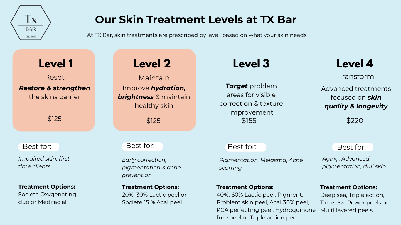 Dry, dehydrated, or dull skin lacks barrier integrity and hydration. Starting at a higher corrective level can irritate or overstimulate the skin. Level 1 restores hydration and barrier function; Level 2 increases cell turnover and promotes radiance without compromising the skin.
